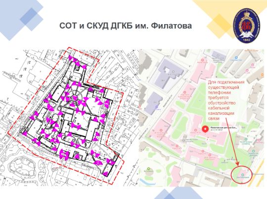 - обустройство СКС (проект “Чистое небо”) в ДГКБ им. Н.Ф. Филатова, в том числе построение системы охранного телевидения (СОТ) емкостью72 видеокамеры и системы контроля и управления доступом (СКУД);